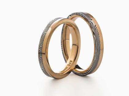 Eheringe aus Damaszenerstahl mit 585/- Rotgold in der Farbe Jaffa, poliert, Lagendamast, gerades Profil, innen bombiert und poliert