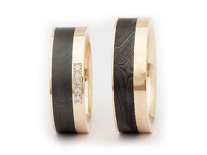 Wagebundt Joachim Bartz Trauringpaar Damaszenerstahl Schwarz-DLC Gelbgold mit Brillanten 0,075ct