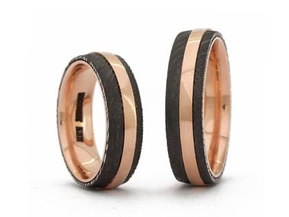 Eheringe aus Damaszenerstahl mit 585/- Rotgold in der Farbe Jaffa, poliert, Lagendamast schwarz DLC beschichtet, außen gewölbt, innen bombiert und poliert